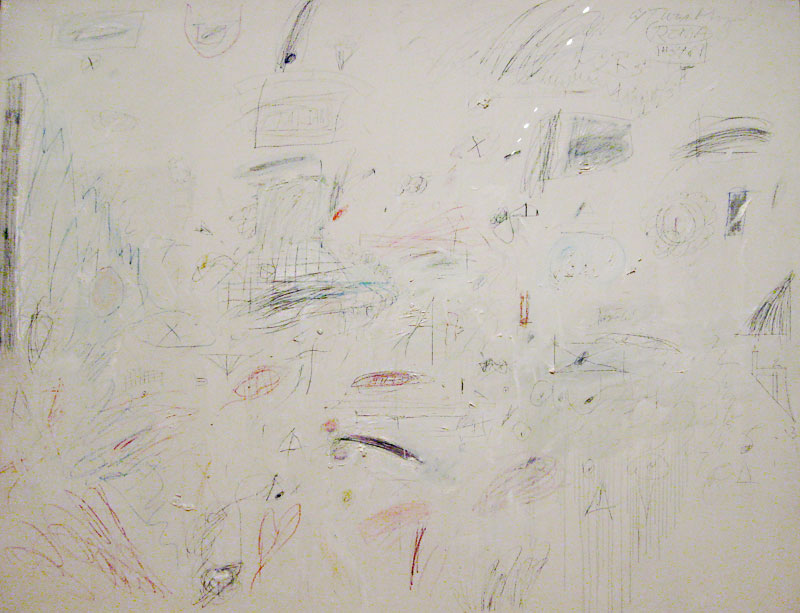 Then there was another painting by Cy Twombly, titled “The Italians”. The only thing on this artwork linking it to Italy was the word “roma” written underneath the artist’s signature at the top right. The rest of it was nothing but childish scribbles that resembled the drawings of my not yet three year old daughter. The excerpt on the museum’s wall said that those graffiti–like marks revealed “the artist’s sensuous joy in manipulating his medium”. Wouldn’t you think that an artist could’ve learned his medium by the age of 33, that’s how old Twombly was when he did this drawing? Later I found out that in 1953 Twombly served in the army as a cryptologist. That definitely explains the artist’s style.